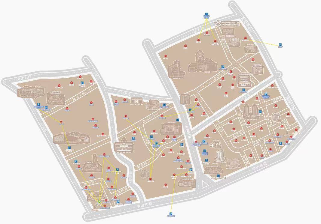 “一张图”,即共和新路街道停车联盟地图。街道组织4个网格开展“地毯式”摸排,不仅覆盖辖区内的居住区、园区、楼宇,还将高架下匝道、道路停车场等公共资源纳入统计。地图上红色标记是居民区,蓝色标记是园区、楼宇,黄色连线是已经达成合作的“停车联盟”。